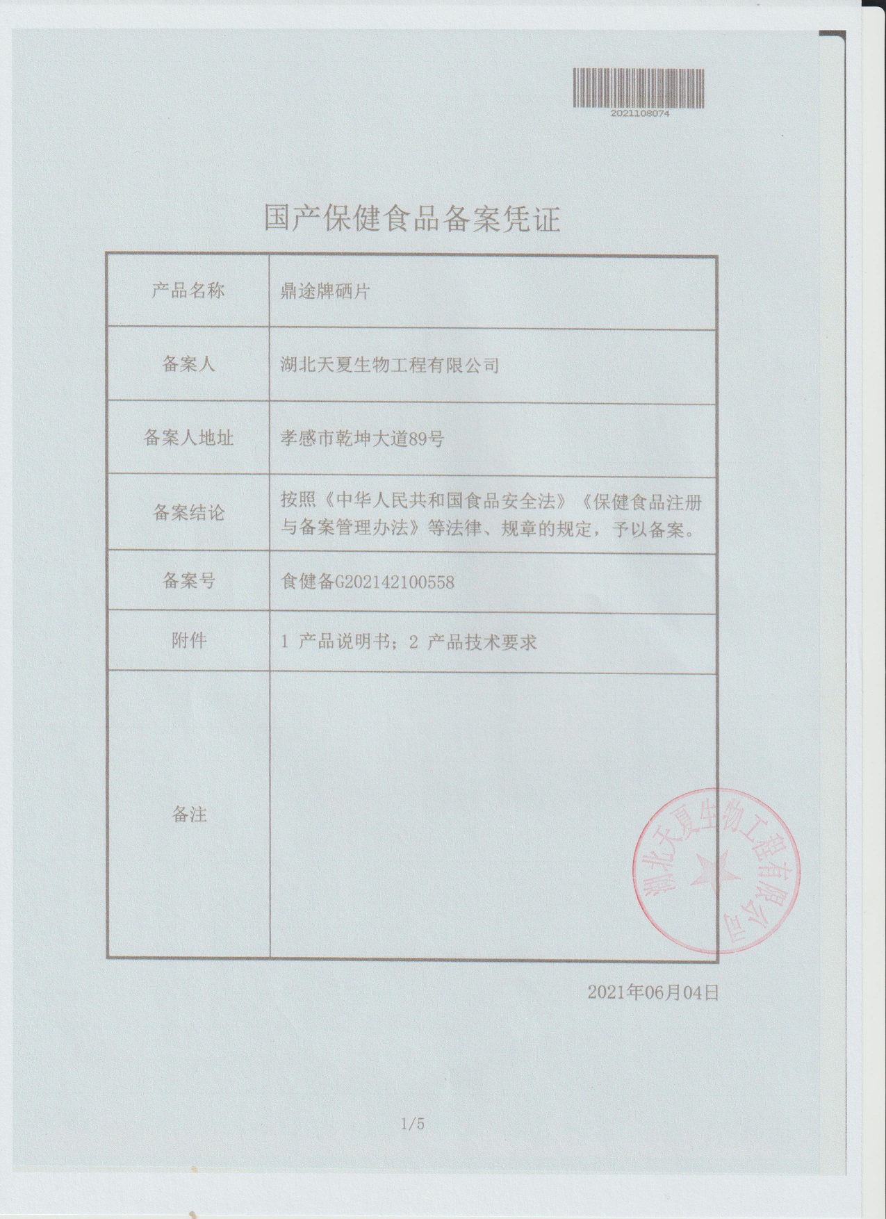 湖北天夏生物工程有限公司技術(shù)攻關(guān)項(xiàng)目,以二款第四代有機(jī)硒(硒蛋白和富硒酵母)雙硒融合、雙硒同補(bǔ)的鼎途牌硒片榮獲國家市場監(jiān)督管理局保健食品批文!食健備G202142100558